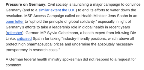 “It is very disconcerting to learn that Germany, the UK, Sweden, Denmark and five other OECD countries are attempting to derail this important effort to create transparency in medicines pricing and medical research and development.