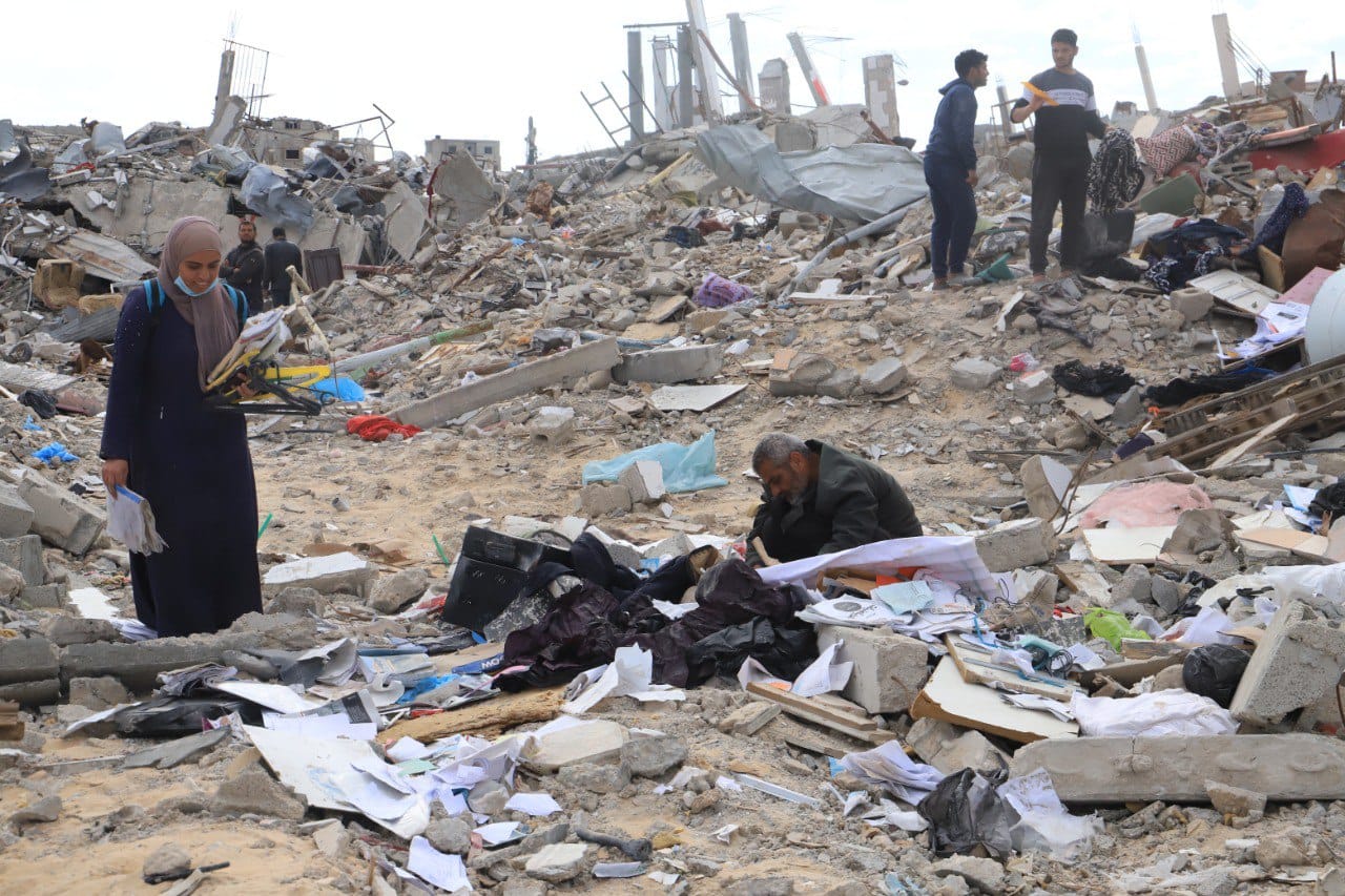 After 15 months Israel‘s war on Gaza, Palestine, and the implementation of the ceasefire on 19 January 2025, displaced Palestinians are attempting to return home to the southern city of Rafah. While people try to rebuild the ruins, Rafah is totally destroyed, with homes, shops, streets and healthcare facilities in ruins and electricity and water systems damaged – and unsafe due to scattered unexploded ordnance in the ruins of buildings. Photo Credit: Mariam Abu Dagga